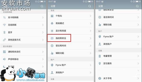 二、然后在设置页面中,再点击进入【指纹和安全】,再进入【指纹管理】,然后按提示设置好4-17位锁屏密码之后,接下来就可以为这款魅族MX6添加指纹了。接下来只需按照提示来录入即可,整体录入大概需要20次作用即可录成一个指纹,如下图所示: