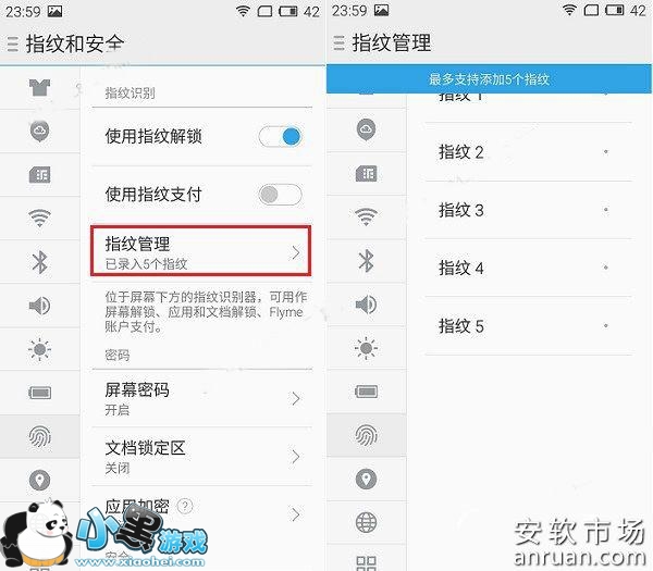 三、最后添加完指纹后,我们可以选择开启指纹屏幕解锁、指纹支付、指纹应用和文档解锁等功能。一样的,魅族MX6最多可以支持录入5组指纹,手指是没有什么讲究的,我们也可以将加入或朋友的指纹录入,此外我们还能够进行对指纹进行添加或删除方面的管理,如下图所示: