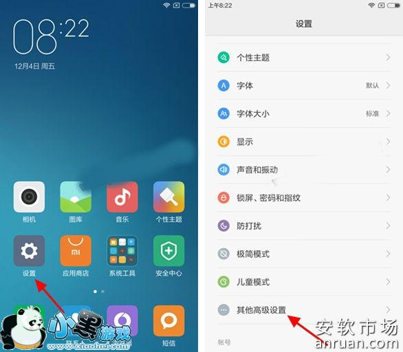 一、首先在红米Pro桌面找到并点击进入【设置】,依次再进入【其他高级设置】设置选项,如下示意图所示。