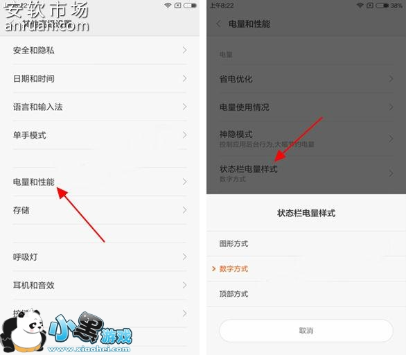 二、然后在红米Pro的“其他高级设置”设置中,我们再点击进入【电量和性能】设置,之后找到并点击【状态栏电量样式】,选择【数字方式】之后,我们就会发现此时红米Pro电池电量以百分比的形式显示了,如下图所示.