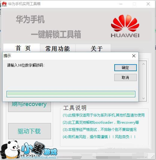 3.运行上面第1步中的华为工具箱.exe文件,在弹出的输入框中,输入上面保存好的16位华为荣耀8解锁码,点击确定之后,如果此时连接正常,工具将手机解锁并恢复出厂然后重启进入待机画面: