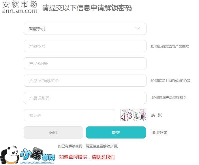 4.按照网站上的要求填写申请资料,按照页面提示填写“产品类别”“产品型号”“产品S/N号”“产品IMEI/MEID”“产品识别码”“验证码”然后 提交,将获得“您的解锁码为:"***************",如长时间未收到解锁密码,请重新或者联络下面的客服。