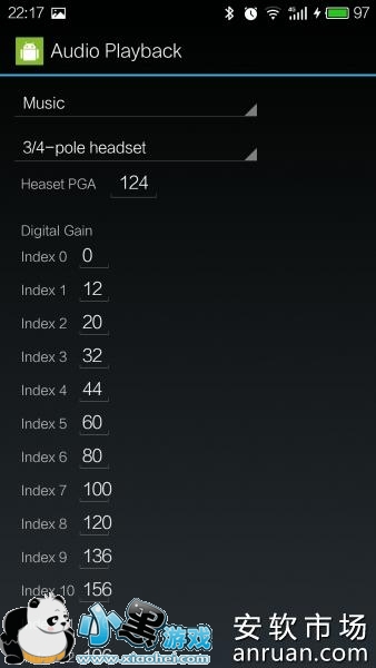 下面一栏是输出设备,3/4 -pole headset即3/4极耳机,也就是带麦或者不带麦的耳机。然后Speaker就是底部的喇叭。然后下面digital gain就可以调节每一级的音量大小。共15级,index 0到15。里面填0到255的值,值越高声音越大推荐调节和我一样,适合高灵敏度耳机。不过也可以按照自己耳机来调节。