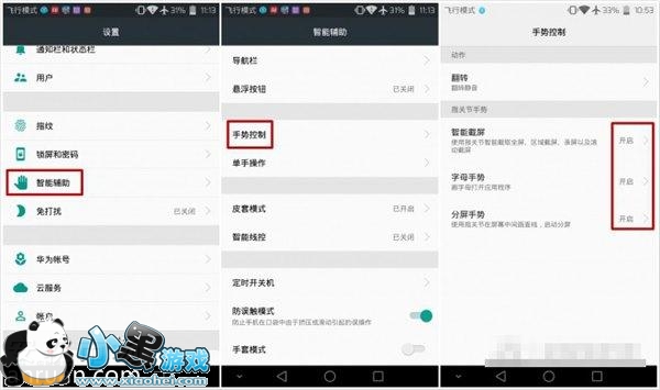 进入智能辅助设置界面,然后选择手势控制。之后我们点击进去会看到智能截屏、字母手势、分屏手势。进入其中,将它们全部打开,后面大有用处。