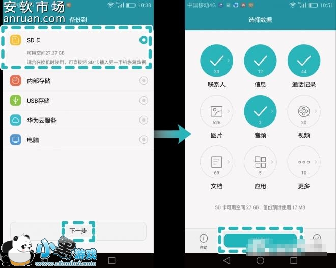 您可以备份数据到【SD卡】、【内部存储】、【USB存储】、【华为云】、【电脑】,在这里我们选择备份到SD卡。