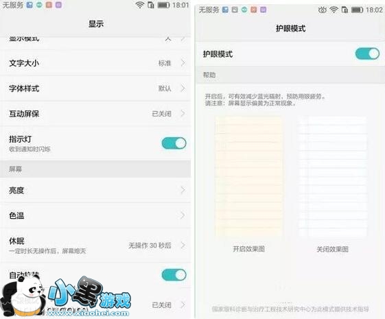 从设置选项界面可以看到,该功能可有效减少蓝光辐射,预防用眼疲劳,贴心地附上了开关效果图,而且注明了国家眼科诊断与治疗工程技术研究中心为此模式提供技术指导。