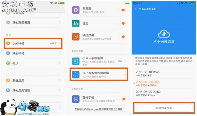 在新手机中登陆相同小米ID ,再从云服务选择恢复,应用、图片、通讯录就回来了。
