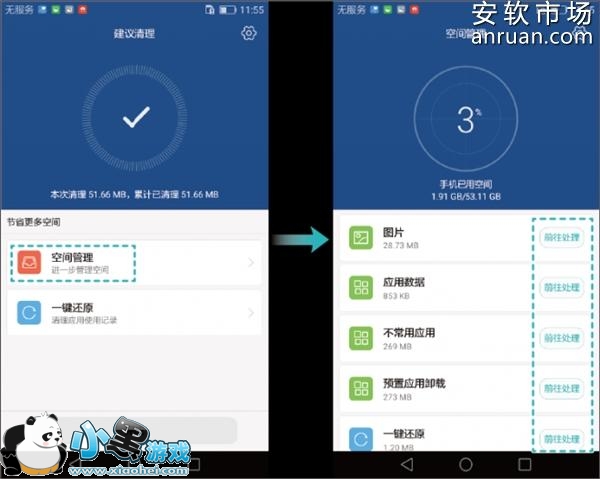 这里,就该万能的【手机管家】登场啦!点击【手机管家】>【清理加速】,在【建议清理】的界面下,勾选所有你想要清理的项,然后点击【一键清理】。这么清理完以后,还是觉得不够神清气爽,可以下滑菜单到最下面的【空间管理】,然后点击处理你想要清理的想可以了。