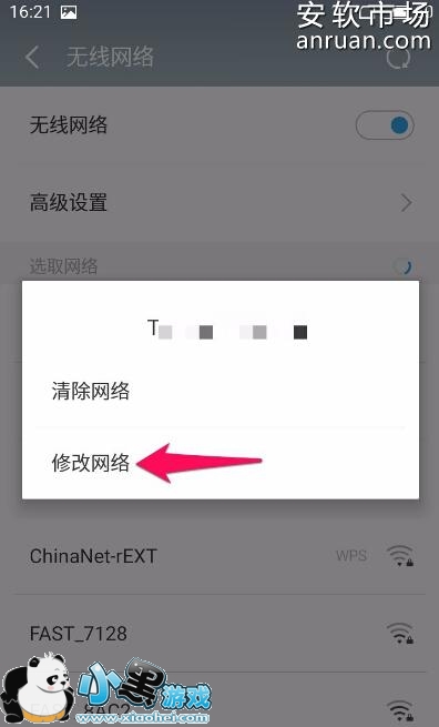 4、长按输入密码错误的WIFI,弹出对话框——选择修改网络,如下图所示
