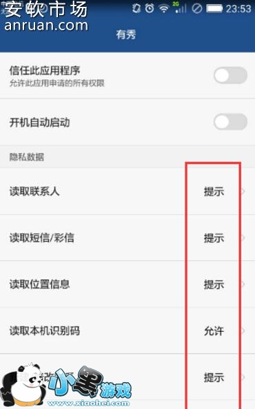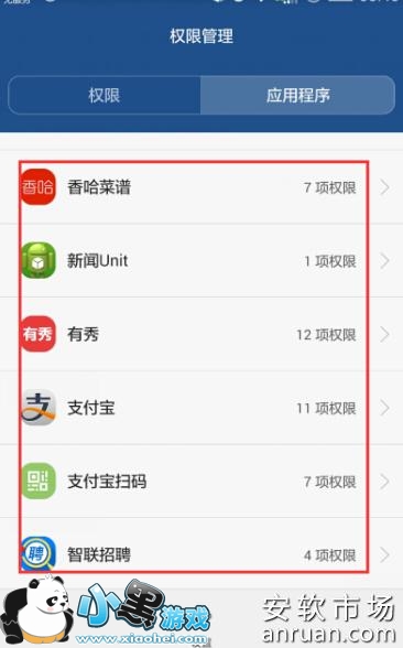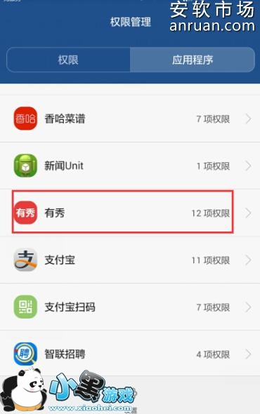 4、在这个界面中可以看到一些软件拥有的权限,例如这里以有秀为例,可以看到当前有秀的权限有多少,点击有秀进入如下图所示