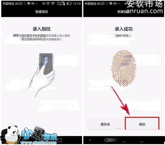 3、开始录入指纹,只要按照要求把需要录入的手指放到后置指纹识别器上面,重复几次即可录入成功,录入完成后会提示录入成功,点击【确定】按钮就完成指纹录入了。(如下图)
