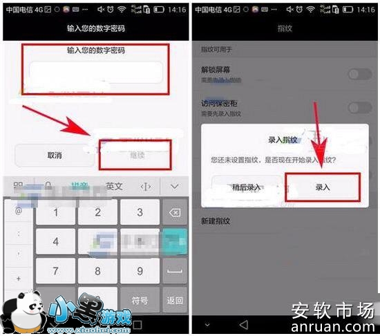 2、因为录入指纹要先验证手机锁屏密码,所以要先在输入框输入手机锁屏密码,输入完成点击【继续】,接着就会提示是否开始录入指纹,这个时候点击【录入】即可。(如下图)