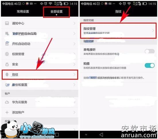 1、先进入设置菜单,点击右上的【全部设置】进入全部设置界面,在全部设置里面找到【指纹】选项,打开以后接着打开【指纹管理】选项。(如下图)