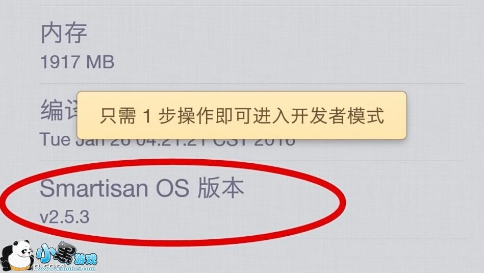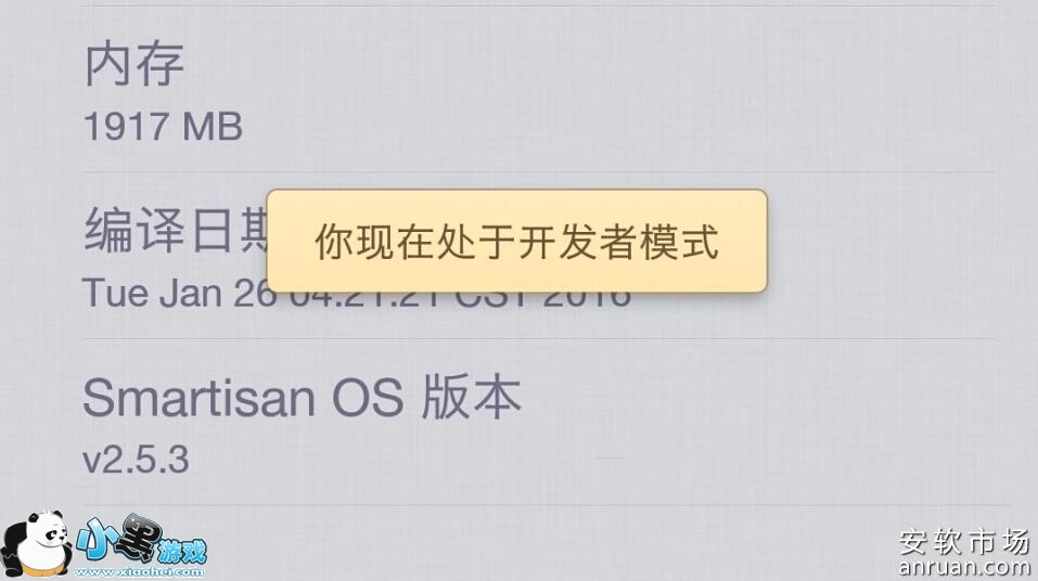 2、进入以后,在底部位置有一个Smartisan OS版本,连续点击该功能,还会有相应的提示,如下图所示