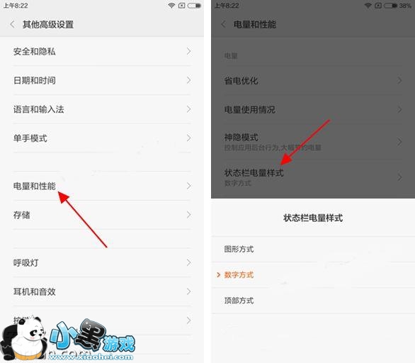 二、然后在红米Note4的“其他高级设置”设置中,我们再点击进入【电量和性能】设置,之后找到并点击【状态栏电量样式】,选择【数字方式】之后,我们就会发现此时红米Note4电池电量以百分比的形式显示了,如下截面图所示