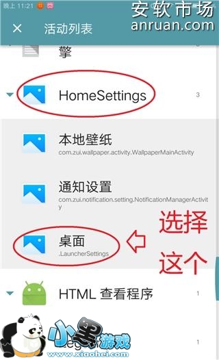 3.在活动列表中找到homesettings,点开这个,选择列表下的桌面