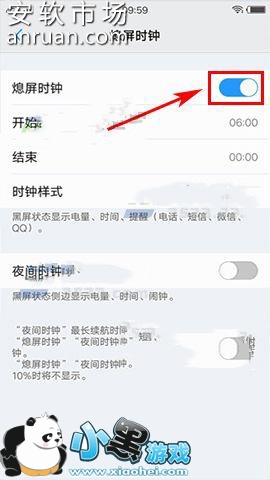 2)接着点击【熄屏时钟】,打开后把开关开启就行了,还可以对时钟的样式等进行自定义的设置。(如下图)
