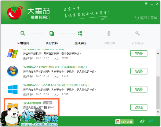 3、之后大番茄会根据你的电脑配置推荐出最佳系统,省了不少人纠结的功夫。软件还有本地镜像安装功能,可以使用自己下载的镜像来重装系统了,相当自由。