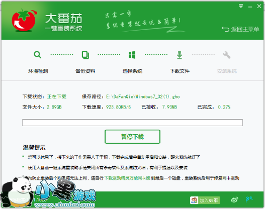 4、点击“安装”后,软件就会自动完成下载到重装的全部过程,无需再人工操作,相当简单,即使没有一点专业知识的人也可以完成重装。不过镜像文件比较大,下载也比较慢。由于是完全重装,所以重装的过程也比较慢,不过因为重装的彻底,重装后电脑提速也比较明显。