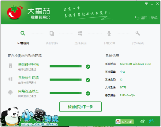 1、打开大番茄后软件会先对电脑进行环境检测,若你的电脑不适用镜像安装,会有提示弹出,防止安装到一半黑屏了造成大麻烦。