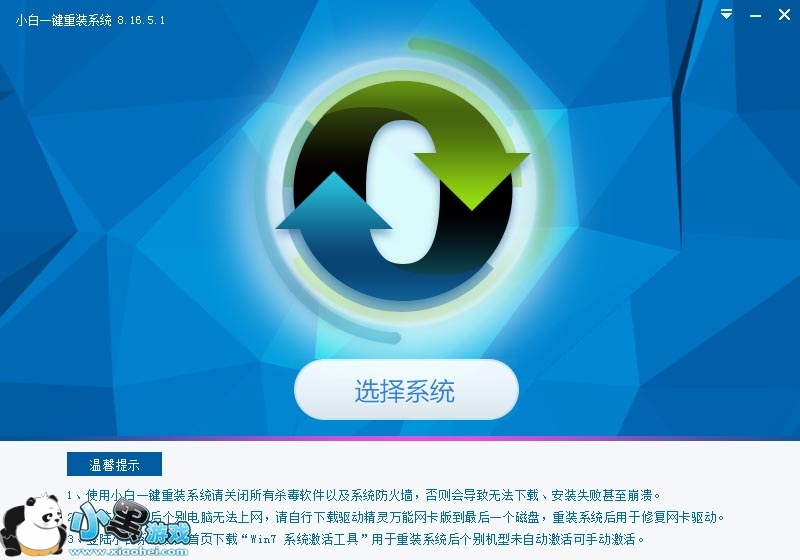 1、下载好小白系统重装软件后打开,待其自动检测好电脑系统环境后出现如下图“选择系统”按钮点击进入;