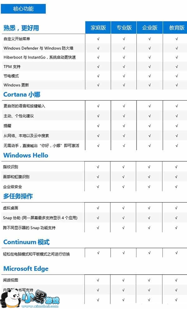 从上图我们可以看出,Win10家庭版、专业版、企业版以及教育版具备所有核心功能。Win10核心功能包括改进的开始菜单、节电模式、Windows Defender以及Windows防火墙、Cortana语音助手、Windows Hello安全登录、新增的多任务操作,可在传统PC和平板模式之间进行切换的Continuum模式以及Microsoft Edge浏览器等。