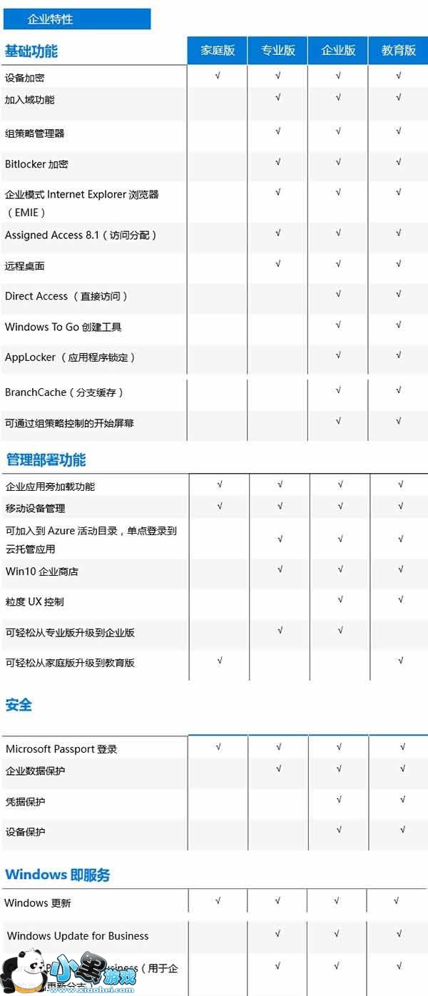 Win10企业特性对照表
