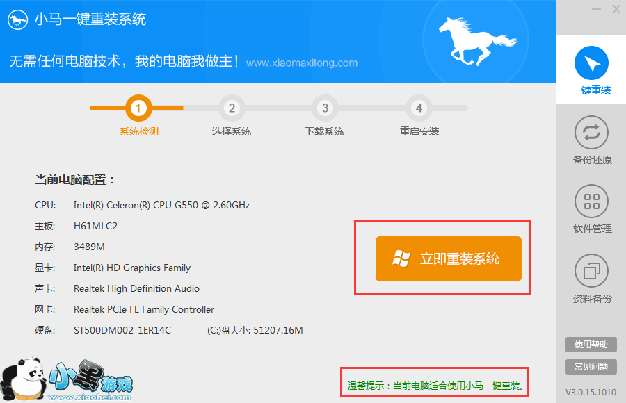二、准备工作完成,我们才真正开始重装。打开小马一键重装系统工具时,会自动进行重装环境检测,显示“当前电脑适合使用小马一键重装”,我们就可以点击“立即重装系统”进入下一步操作。