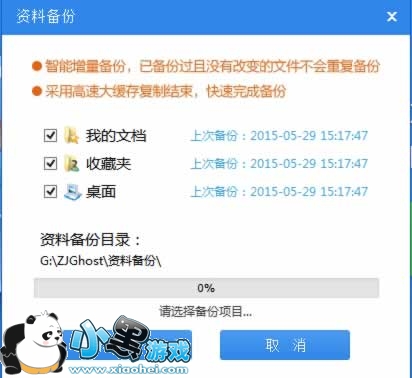 2、进入资料备份界面,通过勾选可以选择对“我的文档”、“收藏夹”、“桌面文件”进行备份,备份资料会保存到自动生成的“ZJGhost/资料备份”目录内,此目录会根据电脑磁盘中最大剩余空间容量作为文件、系统的备份以及下载的系统自动产生;