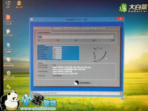 7.自动安装系统弹出如图所示界面,无需任何操作。进度条走完以后,电脑会自动重启安装操作系统,中间无需任何操作,等待一段时间即可安装完成。安装过程中电脑不要断电、关机。如果出现异常报错,建议重新下载一个ylmf系统GHO镜像文件。