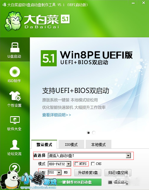 2.将U盘插入电脑中,模式位置建议选择NTFS格式,避免制作成启动盘后U盘无法拷贝大容量文件,这里大概需要等待几分钟。分配给启动盘空间大一些,选择1000M,这样U盘进入PE系统会快一些。