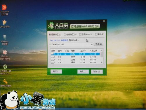 5.进入PE系统后,桌面上有“大白菜PE一键装机”,选择“还原分区”,然后点“更多”找到下载的GHO镜像点“确定”,安装系统到C盘,点“确定”。
