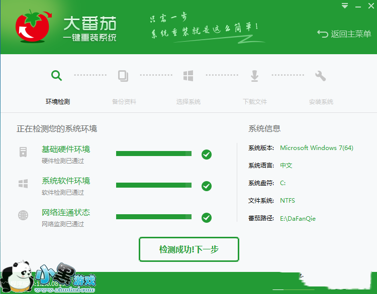 1.点击下载大番茄一键重装系统,并正常打开,点击软件首界面的“立刻重装”按钮进入检测页面,完成后点击“下一步”。