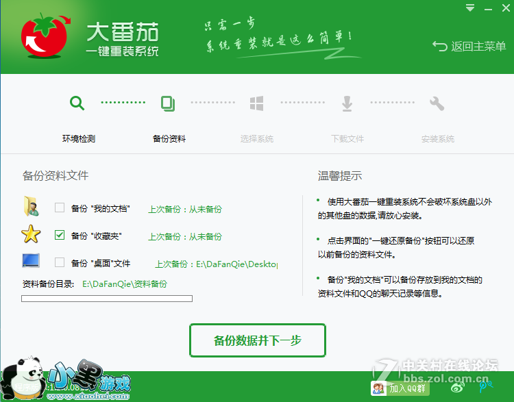 2.选中要备份的内容,点击”备份“按钮,大番茄会自动将文件备份到选中的目录下,备份完毕后点击“下一步”。