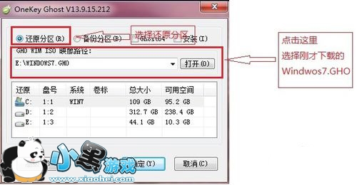 选择还原分区,在GHO WIM ISO映像路径选择刚下载的Windows7.GHO,如图