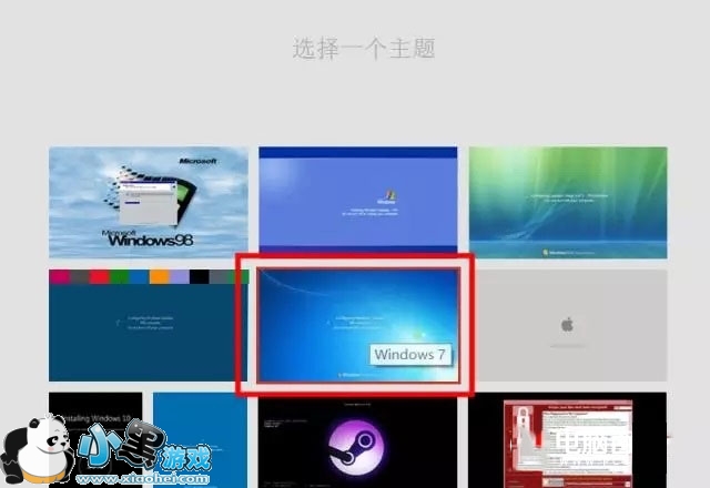 第三步:接下来在页面右侧选择相应的假装系统升级界面。小编这里演示选择“Windows 7”,之后按“F11键”,就可以进入全屏模式,之后可以看到假装Win7升级界面,而且升级进度也是模拟动态的,如图所示。