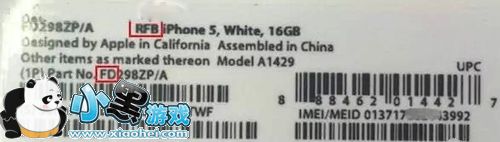 标签特征,iPhone 5 标签与 iPhone 5s 不一样,是纯黑的。iPhone 5 前面的“RFB”是 refurbished 的缩写,意为翻新。官翻机序列号开头为 DQG、DQH、C7G、C3M 等。