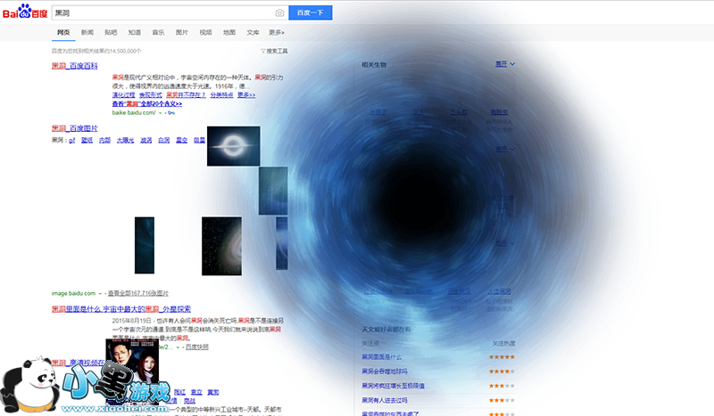 1、打开浏览器进入百度搜索,然后在百度当中输入“黑洞”,屏幕上真会出现一个黑洞,把所有东西都吸进去。