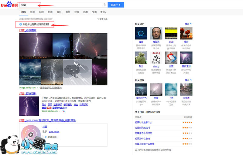 2、在百度中搜索“打雷”真的会出现打雷的声音,而且特别逼真。此外,“布谷鸟”、“海边”、“大风”也会有同样的声音效果。