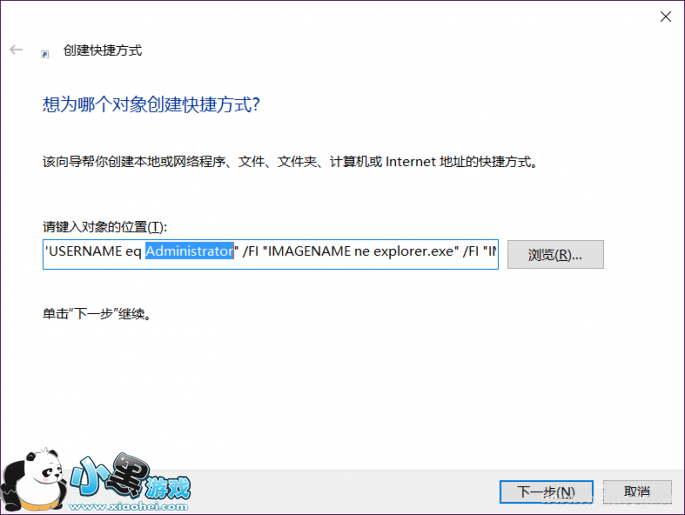 taskkill /F /FI "USERNAME eq Administrator(替换为你电脑的管理员账户名,可以在系统分区内的“用户”目录中查看)" /FI "IMAGENAME ne explorer.exe" /FI "IMAGENAME ne dwm.exe",注意空格。