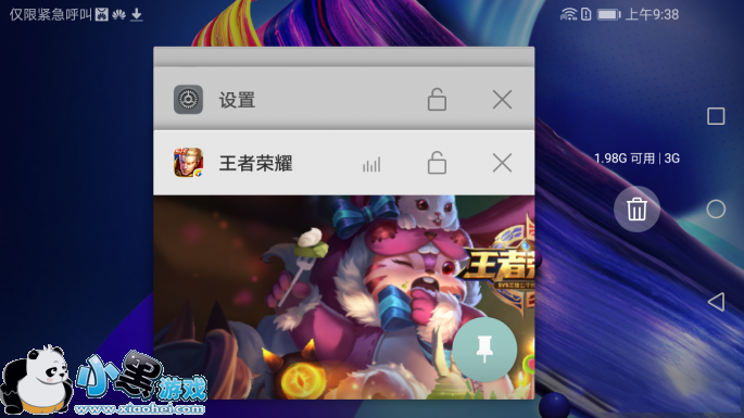 打开屏幕固定后,我们就能正常启动游戏了。以运行《王者荣耀》为例,运行时按最近任务切换到后台应用切换界面,你会发现所有程序预览图下面都会出现一个类似图钉的图标,找到《王者荣耀》的卡片,点击图钉图标,这个APP就能获得屏幕固定的效果了。