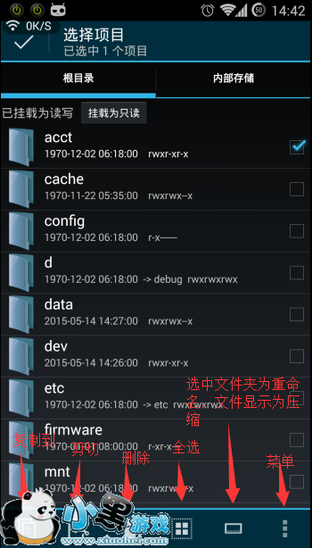 第一步、首先打开RE管理器,因为是汉化版我们很清楚知道ROOT目录,默认挂载为只读,我们只需点击方框中改为读写,即可如图所示,挂载为读写,如果需要对文件操作就要勾选文件夹或者文件后面的框框,表示选中: