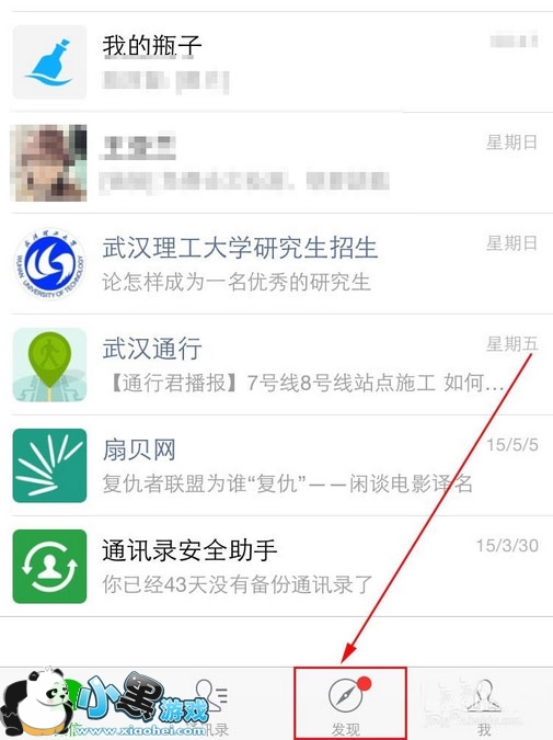 找到微信软件点触打开进入微信主界面,然后在微信主界面右下方找到“发现”选项如下图中红色框选中处,点触“发现”选项进入。