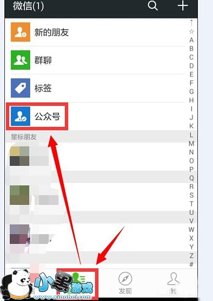 2、进入微信主界面,点击通讯录 然后选择列表中的公众号