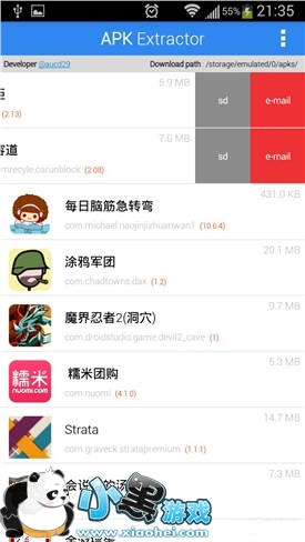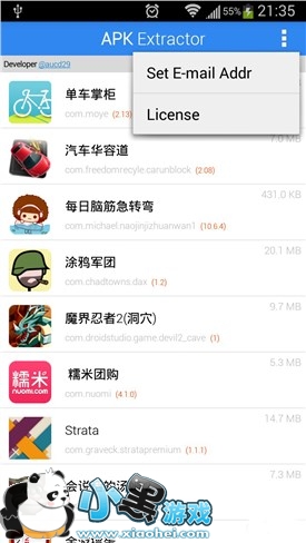 前面已说过Apk Extractor的功能非常简单,打开后界面也非常的简洁,直接显示的是已安装的程序名称,程序的版本号用红色字体显示,显得比较用心。点右上角的选项按钮可以设置默认的EMAIL,点程序可选择提取已安装程序到SD卡还是通过EMAIL发送。