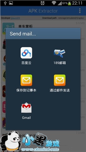 Apk Extractor提供了两种分享方法,提取到SD卡然后自行选择分享,或者直接通过EMAIL进行程序分享。如果选择提取到SD卡,很快就会有提取成功的提示,进入SD卡就可以找到刚提示的APK程序了。而通过EMAIL进行程序分享时会提示选择使用EMAIL程序进行分享。