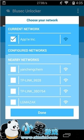 进入主界面,点击「Open slot」, Blusec Unlocker 就会自动搜索附近的 Wi-Fi 热点,并置顶显示你当前连接的 Wi-Fi 热点,选择你信任的 Wi-Fi 热点,点击「Done」,设置完毕。除此之外,Blusec Unlocker 还支持蓝绑定,操作方式与 WIFI 如出一辙,文章就不作详述了。