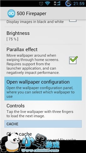 很多朋友说我都设置过了,可壁纸就是不变?那是因为还差最重要的一步:点open walpaper configuration打开系统动态壁纸设置,选择500 Firepaper,设置好后就可体验自动换壁纸的快感了。
