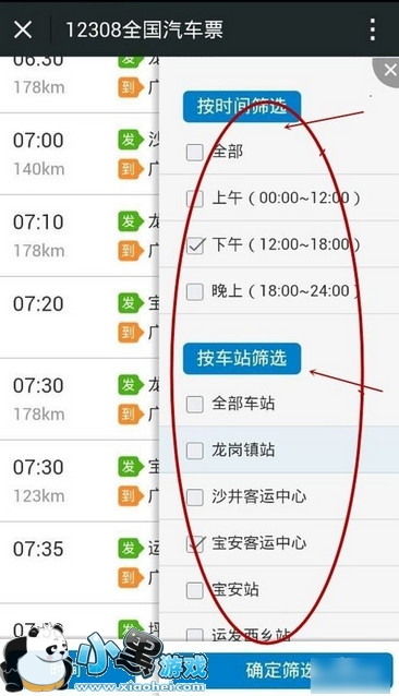 点击查询之后,会进入到查询班次的界面,这里都是深圳到广州天河的所以班次信息。可以先根据发车时间或者票价进行排序,然后根据自己的需要筛选车站和发车时段。选择好之后,确认筛选。
