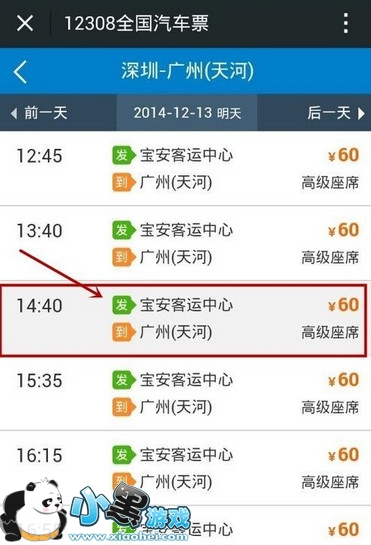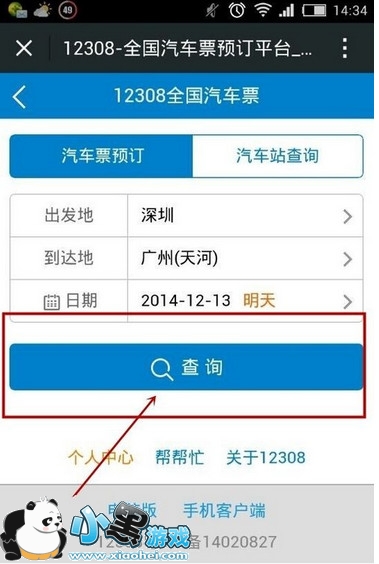 例如,我要在2014年12月13日,从深圳到广州天河客运站,我在在选框里选择深圳,广州天河,以及日期即可。选择好了之后,点击查询。